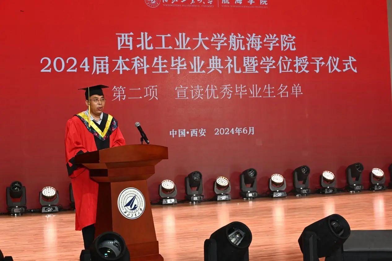 乔月依作优秀毕业生代表发言。她回顾了四年校园学习生活中的点滴印象,并祝愿同学们鹏程万里、一生向阳。