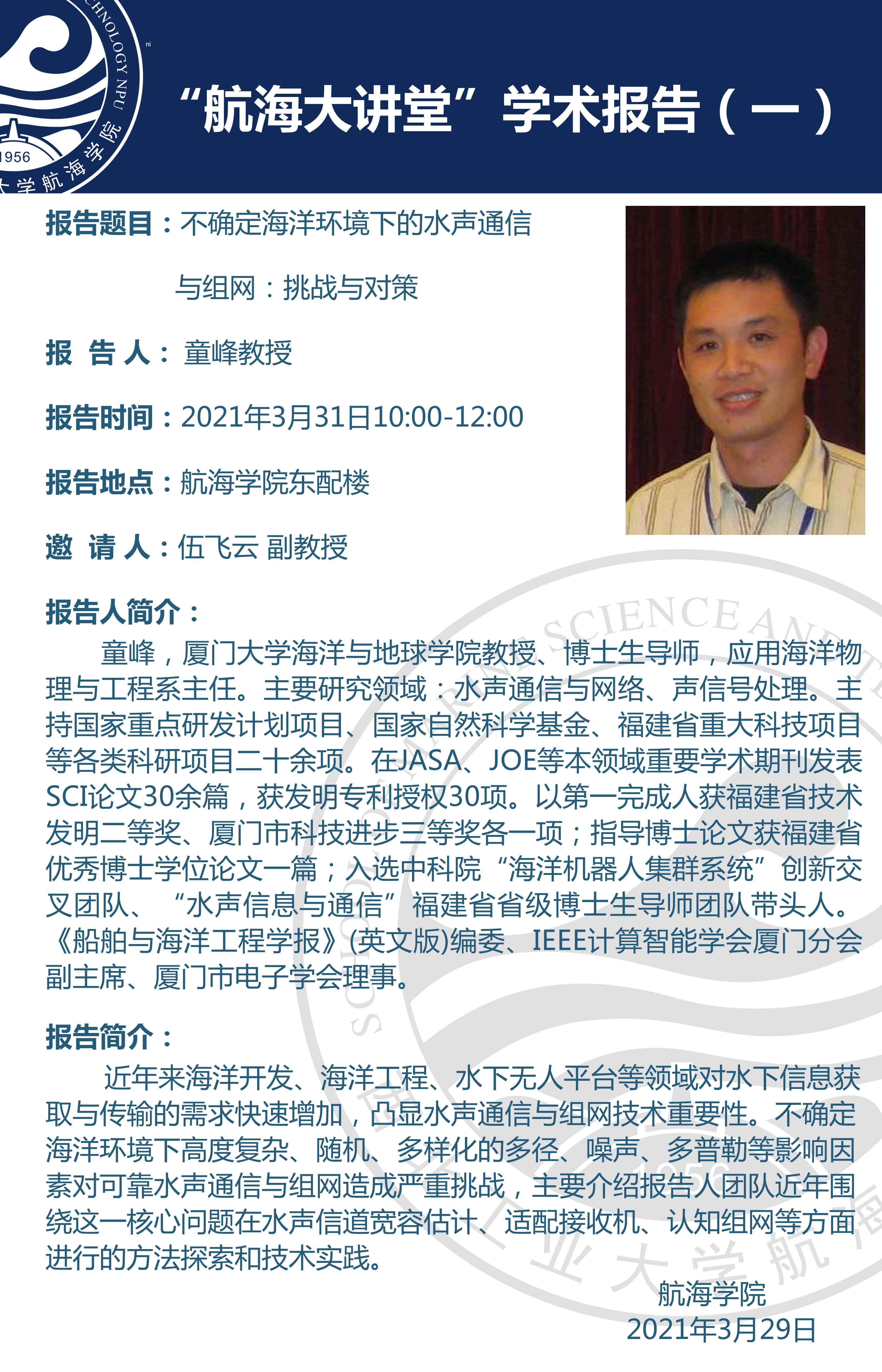 报告人简介:童峰,厦门大学海洋与地球公司教授、博士生导师,应用海洋物理与工程系主任。主要研究领域:水声通信与网络、声信号处理。主持国家重点研发计划项目、国家自然科学基金、福建省重大科技项目等各类科研项目二十余项。在JASA、JOE等本领域重要学术期刊发表SCI论文30余篇,获发明专利授权30项。以第一完成人获福建省技术发明二等奖、厦门市科技进步三等奖各一项;指导博士论文获福建省优秀博士学位论文一篇;入选中科院“海洋机器人集群系统”创新交叉团队、“水声信息与通信”福建省省级博士生导师团队带头人。《船舶与海洋工程学报》(英文版)编委、IEEE计算智能学会厦门分会副主席、厦门市电子学会理事。
