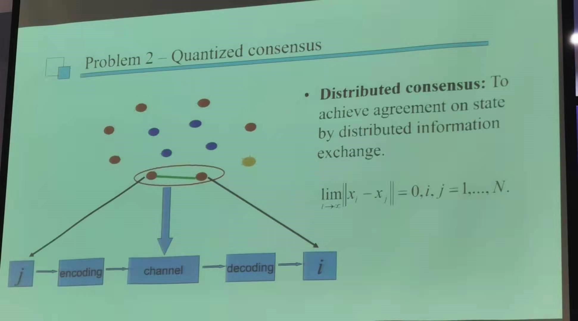 刘帅教授首先介绍了网络控制背景下的非线性控制器设计方法。针对一类典型的下三角系统,在传感器到控制器以及控制器到传感器之间分别设计事件触发控制器,使得整个系统在控制过程中实现非周期性的信息传递,解决了通信资源受限下的非线性系统控制问题。其次,针对分布式非线性连续系统的一致性控制问题,考虑实际系统信息传递时需经过量化处理,分别设计了均匀量化与对数量化两种量化方式下的系统一致性控制器。通过引入高增益状态观测器,设计估计器参数实现系统状态趋于态观测器得到的状态估计值。再通过设计参数保证所有子系统的状态估计值趋同,从而实现所有子系统的一致性控制。