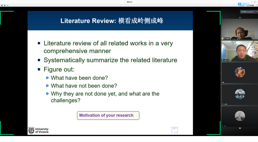7月3日上午10:30,加拿大维多利亚大学施阳教授应mjm世界杯官网李慧平教授的邀请,为公司师生作题为博士生培养和博士生科学研究方面的线上学术报告会。会议由李慧平教授主持,公司200余名师生参会。报告会从10:30持续到13:00,由两组报告组成,分别为:报告一《如何开展博士阶段的学习和开题》;报告二《如何开展博士阶段的文献综述和科学研究》。