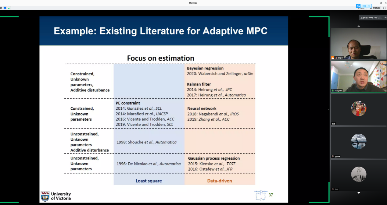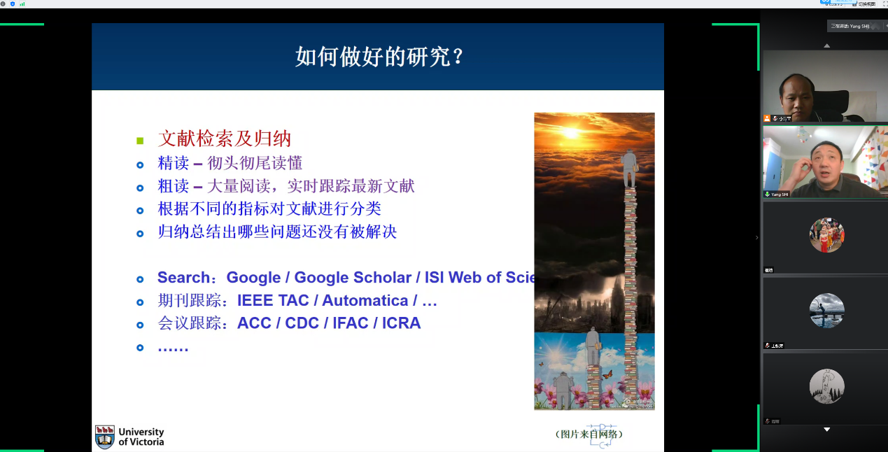 随后,施阳老师强调阅读文献后需要进行系统化的总结,即看文献也需要横看成岭侧成峰,来来回回的看文献。在阅读文献时候需要反过来思考别人为什么会提出这个问题,这篇文章的贡献与难点是什么,是用什么方法解决这个问题的,用的方法是基于哪篇文章的,这篇文章与原版的区别是什么,做了哪些改动使得作者可以讲清楚自己的贡献。之后,施阳老师借助自适应模型预测控制这一算法详细讲解了在阅读文献时候需要做哪些相关工作。
