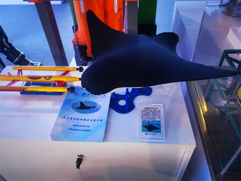 公司项科研成果在本次成就展亮相,向公众展示了公司“十三五”期间在科技创新领域取得的部分阶段性成就。一是公司牵头研制的滑扑一体仿蝠鲼柔体潜水器(负责人:潘光教授)。该项目受科技部国家重点研发计划“深海关键技术与装备”重点专项与“智能机器人”重点专项资助,研发的500公斤级滑扑一体仿蝠鲼柔体潜水器,成功完成世界首例大尺度仿生柔体潜水器1025米大深度滑扑一体航行试验,处于世界先进行列。