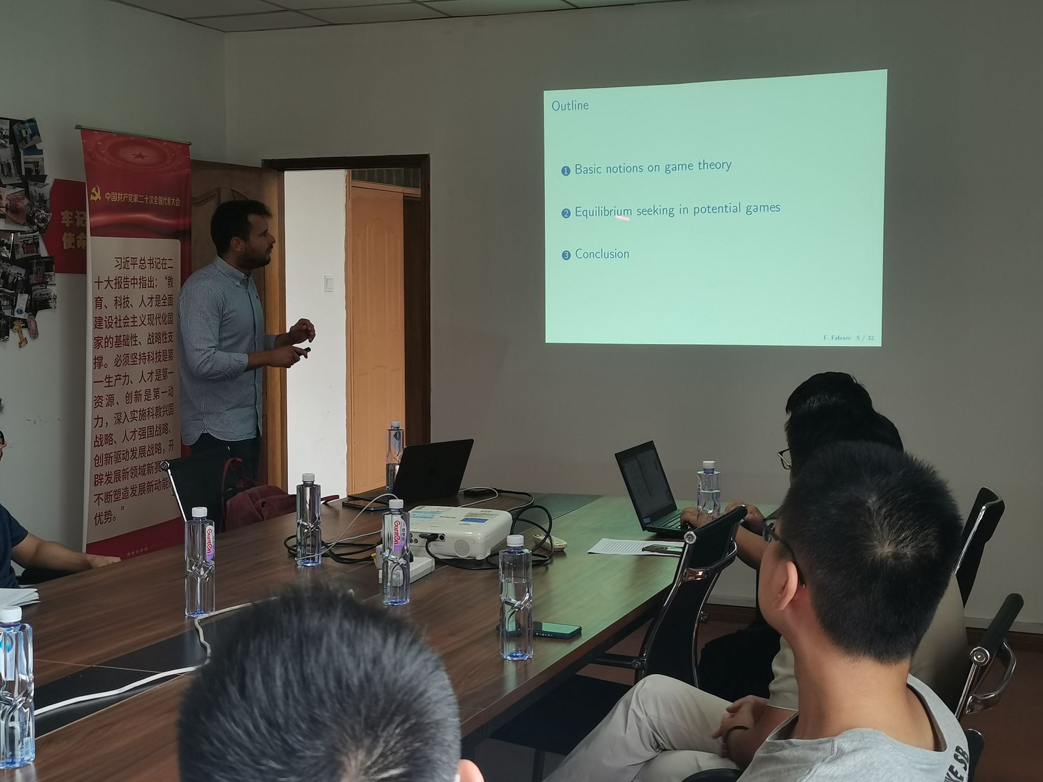 Filippo Fabiani教授的报告以清晰的逻辑,系统地阐述了博弈论在复杂多智能体系统控制中的应用。报告分为三个部分:首先,他简明扼要地回顾了博弈论的基本概念,包括参与者、策略、收益函数等核心要素,并对不同类型的博弈进行了简要分类,为后续内容奠定了理论基础。其次,报告重点探讨了潜在博弈及其均衡求解问题。Filippo Fabiani教授详细解释了潜在博弈的定义和特性,并介绍了几种有效的均衡求解算法,例如梯度下降法等,并分析了这些算法的优缺点及适用场景。最后,Filippo Fabiani教授将博弈论基础和潜在博弈均衡求解方法结合起来,深入分析了如何利用这些理论和方法来控制复杂的多智能体系统。他以具体的交通流制、电网控制等案例或模型为例,展示了如何将实际问题转化为博弈论模型,如何设计相应的控制策略,以及如何评估控制效果。