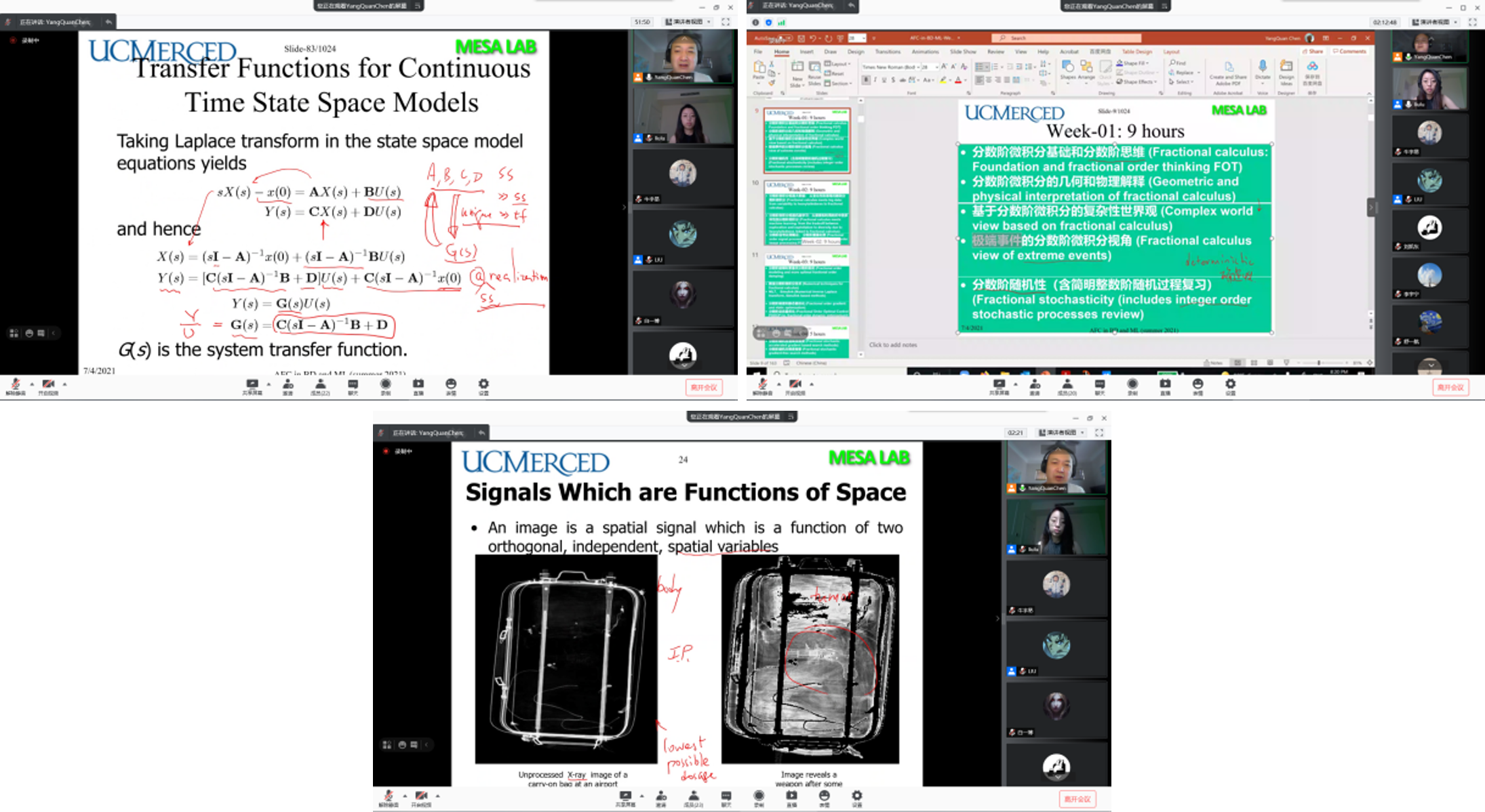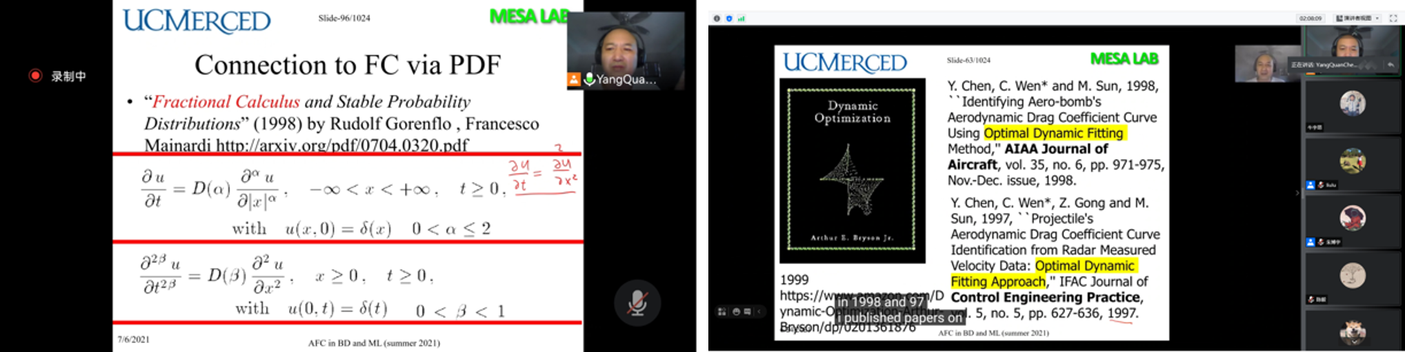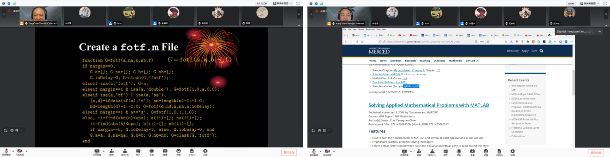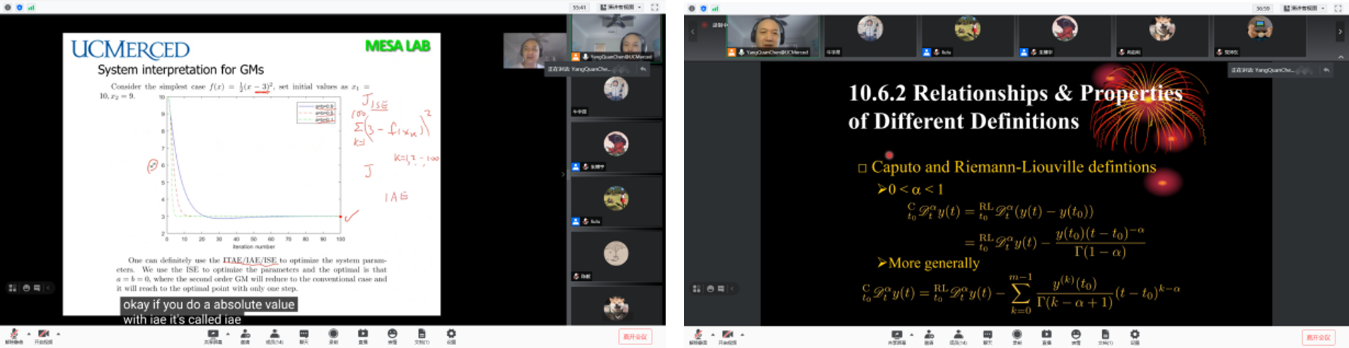 7月5日- 7月28日,应mjm世界杯官网刘禄老师邀请,加州大学默塞德分校工程公司YangQuan Chen教授于线上开展分数阶微积分与机器学习课程,选课员工一共20人,其中本科生9人,研究生11人,本课程一共32学时,以分数阶微积分(非整数阶微分或积分)及其在大数据和机器学习中的应用为主线,介绍国际热点研究问题分数阶微积分基础和分数阶思想、分数阶微积分与大数据、机器学习的关联,并介绍数值分数阶微积分技术、分数阶梯度和静动态最优化问题等,以及复杂动态系统的分数阶动态建模和控制、分数阶信号处理的基础知识。