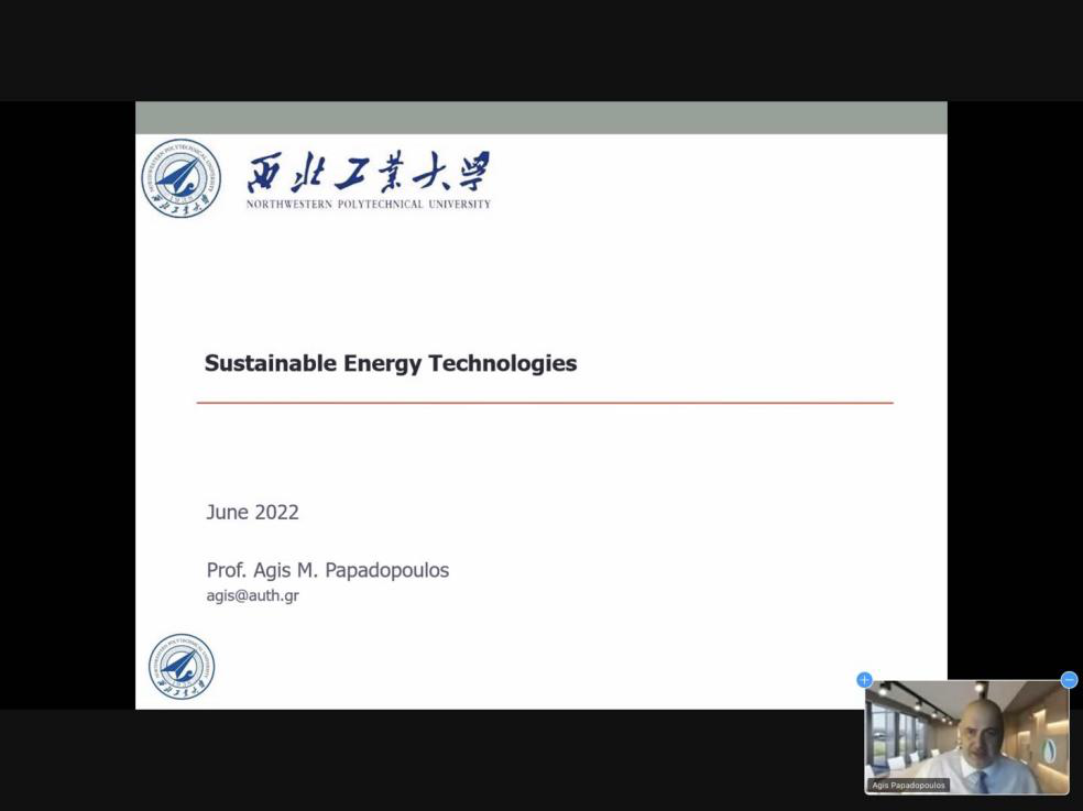 Agis M.Papadopoulo教授首先介绍了能量链的概念,即不同形式的能量向可利用的另一种能量形式的转化。其次,介绍了各种可持续的能源技术,如风力发电机,太阳能集热器,地热能和生物质能的应用,还有能量储存技术。