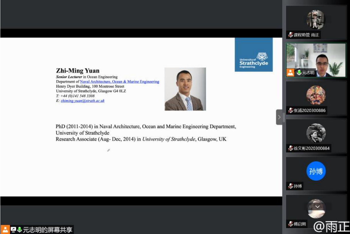 2022年7月4日至7月15日,mjm世界杯官网暑期国际学堂课程《Dynamics of Ocean Engineering(海洋工程动力学)》顺利开展。课程由来自英国斯克莱德大学的元志明博士授课,课程历时两周,mjm世界杯官网杜鹏老师为校内联系人。