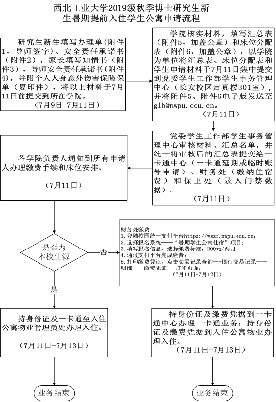 2.请各公司完成需提前入住的2019级秋季博士研究生新生的具体住宿床位分配,完成床位分配表(附件6)填写。请于7月11日10:00前将床位分配表(附件6)电子版发送至员工事务管理中心邮箱glb@nwpu.edu.cn,纸质版(分管员工工作的公司领导签字,加盖公司公章)提交至党委员工工作部员工事务管理中心(长安校区启真楼301室)。