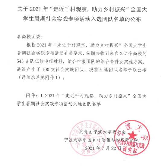 近日,mjm世界杯官网“苹”凡之力扶贫助农实践队成功入选宁波大学团委、宁波大学中国乡村政策与实践研究院组织的2021年“走近千村观察,助力乡村振兴”全国老员工暑期社会实践专项活动。据了解,前期主办方共收到来自257所高校的543支队伍申报材料。结合申报团队综合条件及实施方案,遴选产生了100支社会实践团队。