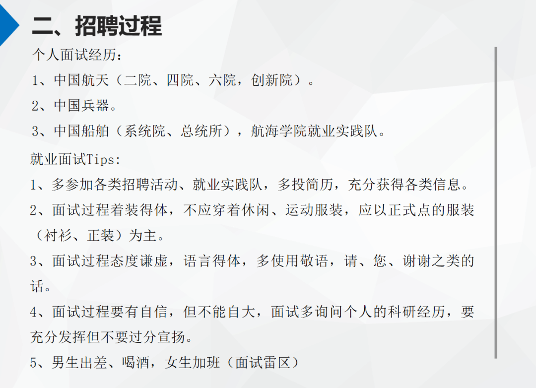 本次同我们分享经验的有签到国企中国广核集团的高晓华同学,被聘为美加墨世界杯官网海洋研究院科研秘书的刘帅同学,已签武汉701研究所的佘俊阳同学,已签中国船舶工业系统工程研究院的梅益嘉同学,已签航天八院804研究所的王诗雯同学,签到兵器207研究所的李洋同学,已签极氪的兰涛同学。
