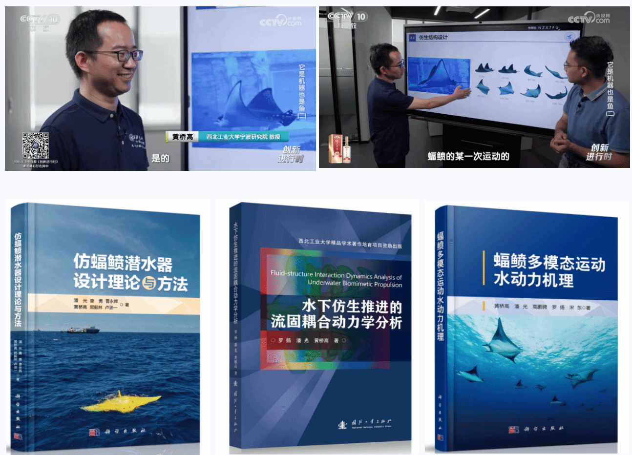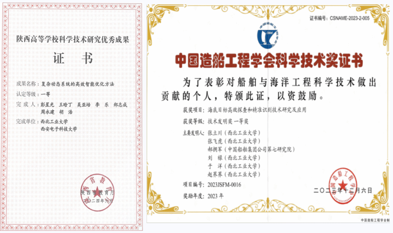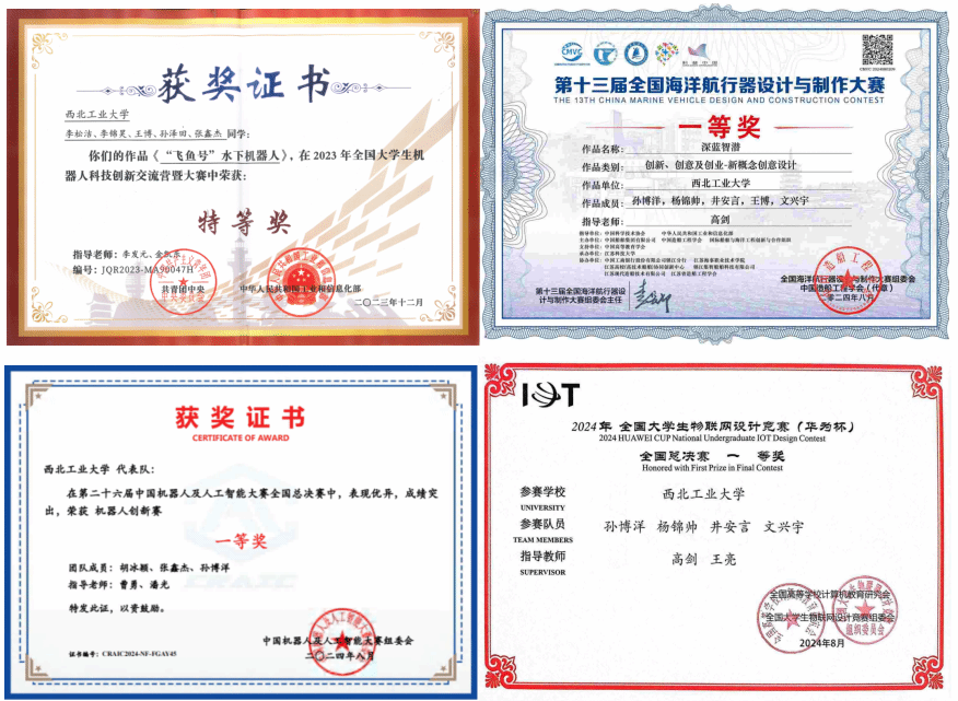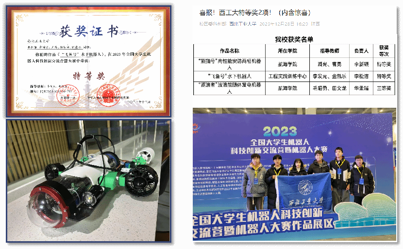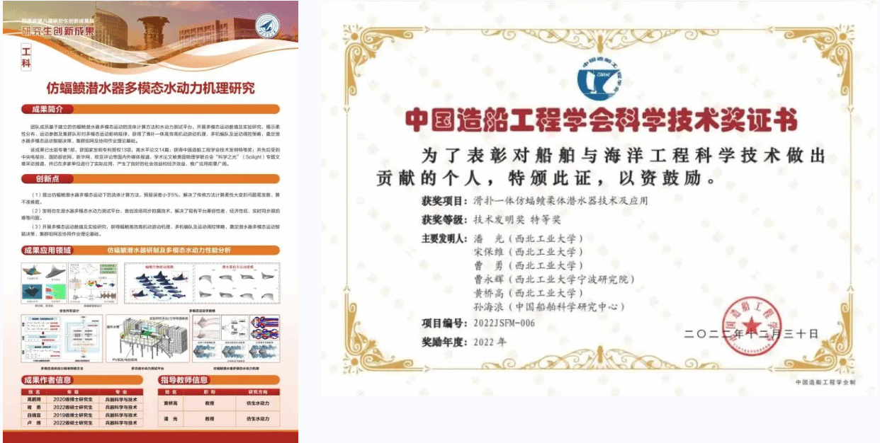 黄桥高教授指导的研究生“智能仿生潜水器”科技创新团队依托“自主水下航行器”国防科技创新团队、翱翔重点实验室和“无人水下运载技术”工信部重点实验室,专注于长航时、高机动、高稳定、高生物亲和仿生潜水器开发及其内在流体物理机制探索。团队在水下仿生领域承担国家重点研发计划、国家自然科学基金等课题10余项,取得显著学术成就,出版专著3部,授权国家发明专利60余件,发表学术论文80余篇,其中关于仿生集群水动力特性研究成果被国际流体物理知名期刊Physics of Fluids作为主编推荐特色文章发表,并被美国物理学联合会“科学之光”专题报道;连续入选陕西省第七届、第八届研究生创新成果展(A档)。研制的系列化仿蝠鲼柔体潜水器完成了全球首例仿生装备千米级深海作业任务,以及我国首次仿生潜水器珊瑚礁生态监测作业,成果受邀参加国家“十三五”科技创新成就展。“滑扑一体仿蝠鲼柔体潜水器技术及应用”获2022年中国造船工程学会技术发明特等奖,“仿生潜水器流体设计理论方法及应用”在2024年中国航海学会科技成果评价中被评议为“国际领先水平”。未来,团队将进一步开展感知-推进一体化仿生胸鳍、智能化与环境适应性、集群自主决策与作业等研究,推动我国仿生水下装备设计与制造技术跨越式发展。