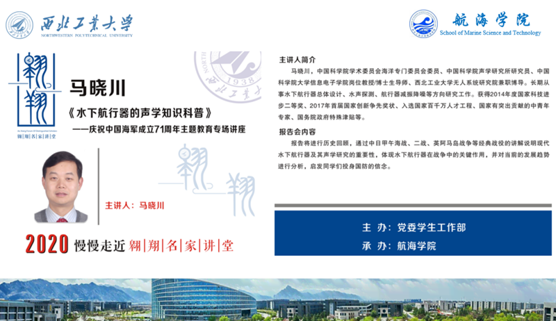 受疫情影响,此次报告在线上举行。除西工大师生外,此次报告还吸引了来自海军潜艇公司、中科院力学所、国家深海基地等单位的同行参与。报告主要进行了历史回顾,通过中日甲午海战、二战、英阿马岛战争等经典战役的讲解,说明现代水下航行器及其声学研究的重要性,体现水下航行器在战争中的关键作用,并对当前的发展趋势进行了分析,帮助同学们树立投身国防的信念。