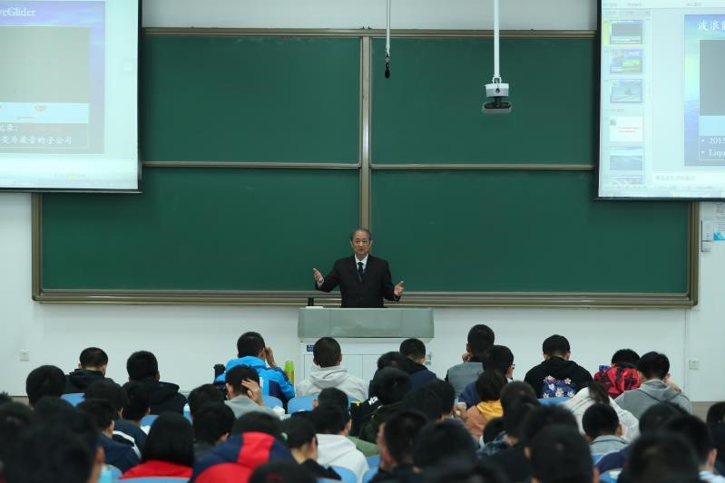 马院士从感受深蓝、海洋无人航行器的蓬勃发展、海洋声学感知团队做了什么、结语之大学的创新文化几个方面向海院学子讲述,教室气氛热烈,同学们热情高涨,认真聆听。