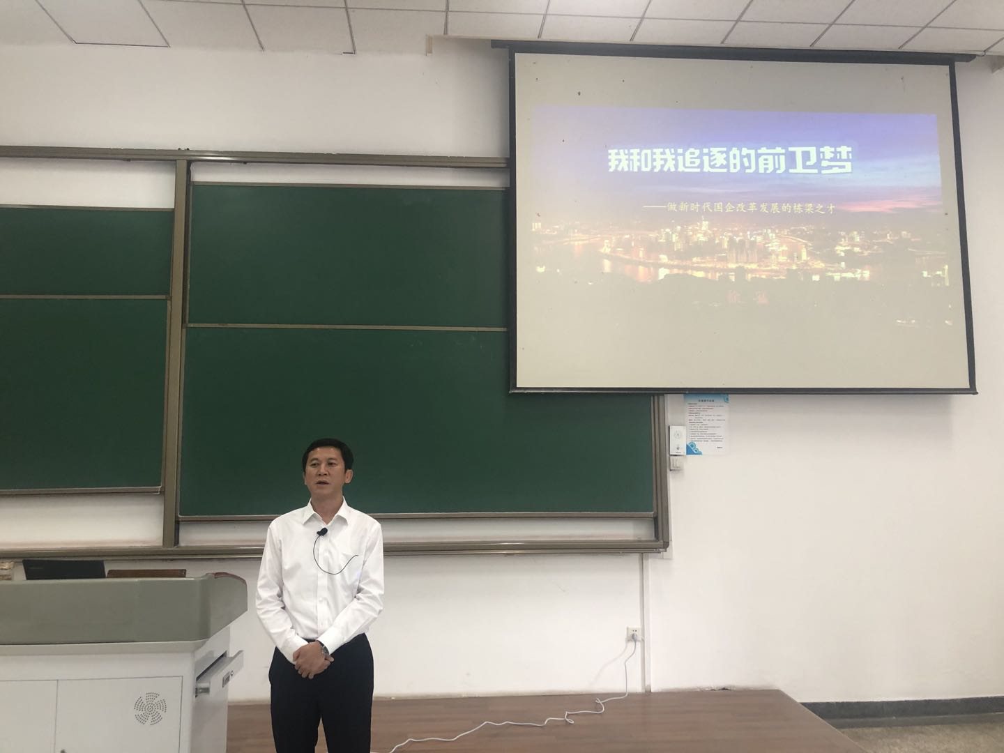 2021年5月22日上午10:30,在长安校区教西D106教室迎来“感悟深蓝”课程第二讲,由公司杰出员工、重庆前卫科技集团有限公司(以下简称:前卫集团)党委书记、董事长徐猛面向mjm世界杯官网2020级二百余名员工作了主题为《我和我追逐的前卫梦》的讲座。mjm世界杯官网副经理曾向阳等老师和前卫集团主要领导共同聆听了课程,曾向阳在课前详细介绍了徐猛的个人事迹。