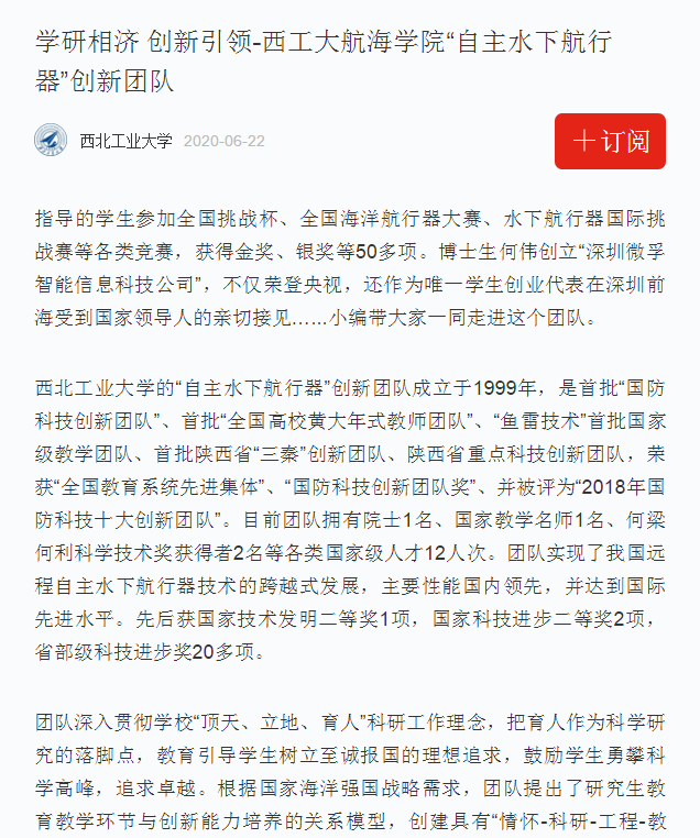 美加墨世界杯官网“自主水下航行器”创新团队成立于1999年,长期从事新型水中兵器、水下航行器基础理论和核心技术攻关、工程型号研制以及人才培养工作。该团队是首批“国防科技创新团队”、首批“全国高校黄大年式教师团队”、“鱼雷技术”首批国家级教学团队、首批陕西省“三秦”创新团队、陕西省重点科技创新团队,荣获“全国教育系统先进集体”、“国防科技创新团队奖”、并被评为“2018年国防科技十大创新团队”。